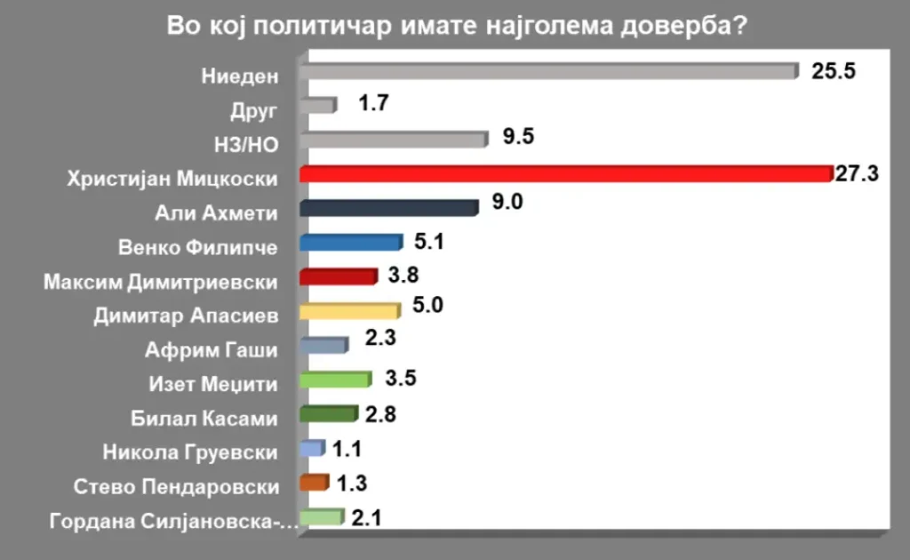 A poll conducted by IPIS shows that VMRO-DPMNE easily dominates the political scene, while its leader, Prime Minister Hristijan Mickoski, is by far the most popular politician in Macedonia.